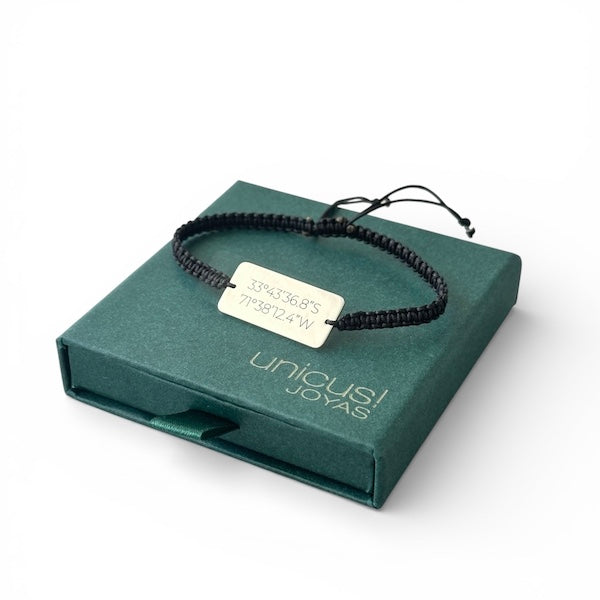 Esta Pulsera personalizada es fabricada sobre una Placa de Plata, grabado con Laser bajo relieve de Coordenadas Decimales de un punto en el Planeta.